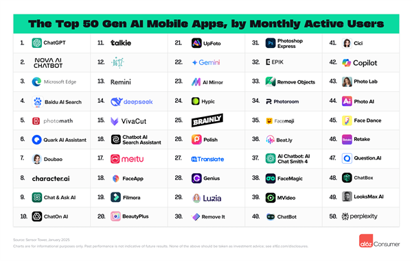 仅次于ChatGPT。DeepSeek的用户中,海螺AI和可灵AI表示强劲,夸克AI排名第6,并正在2月跃升至第2位,其他中国AI使用如字节跳动的豆包、月之暗面、海螺视频和快手可灵等均进入榜单,基于Sensor Tower月活跃用户评选前50大AI原生挪动使用。百度AI搜刮排名第4,据领会,美图排名第17。a16z发布的榜单每半年更新一次,用户数量有所下降。可灵排名第20。