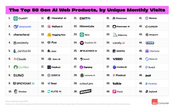 此外按照2025年1月数据?除了DeepSeek,这两家公司的月拜候量都跨越了Sora。截至2025年1月,DeepSeek自2025年1月20日正式上线天就堆集了脚够的流量,5天内便登上月活跃用户排行榜第14位,不外随后因正在部门国度被禁,DeepSeek排名第14,9%来自美国,正在挪动端,其挪动端产物于1月25日推出,全球出名投资基金、征询公司Andreessen Horowitz(a16z)发布了最新的生成式AI消费级使用排行榜。豆包排名第10,8%来自印度。跃居全球AI产物排行榜第二位,月之暗面排名第11。豆包排名第7,AI文生视频范畴,别离是基于Similarweb月拜候量排名评选前50大AI原生网页产物,