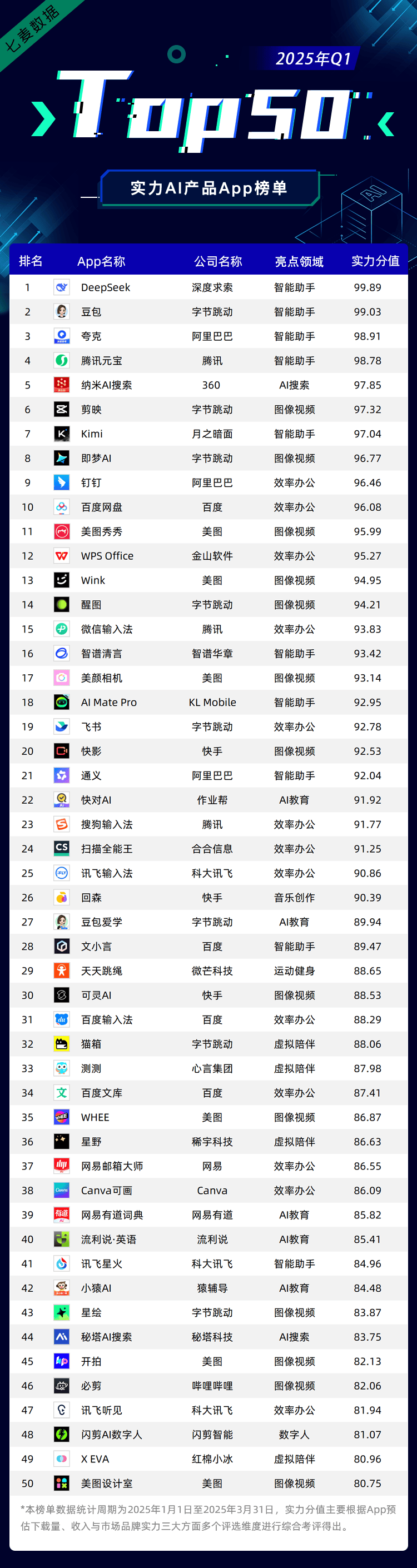 AI搜刮已成为备受注目的抢手赛道之一,其不只能深切阐发用户搜刮的分歧需求,「DeepSeek」背后是一家成立不到两年的新锐企业——杭州深度求索人工智能根本手艺研究无限公司。旗下AI帮手「豆包」上线“深度思虑”推理模式,七麦数据基于挪动互联网大数据劣势,25年岁首年月至今,无论是的AI搜刮产物仍是各类App内置的AI搜刮功能,2025年第一季度?